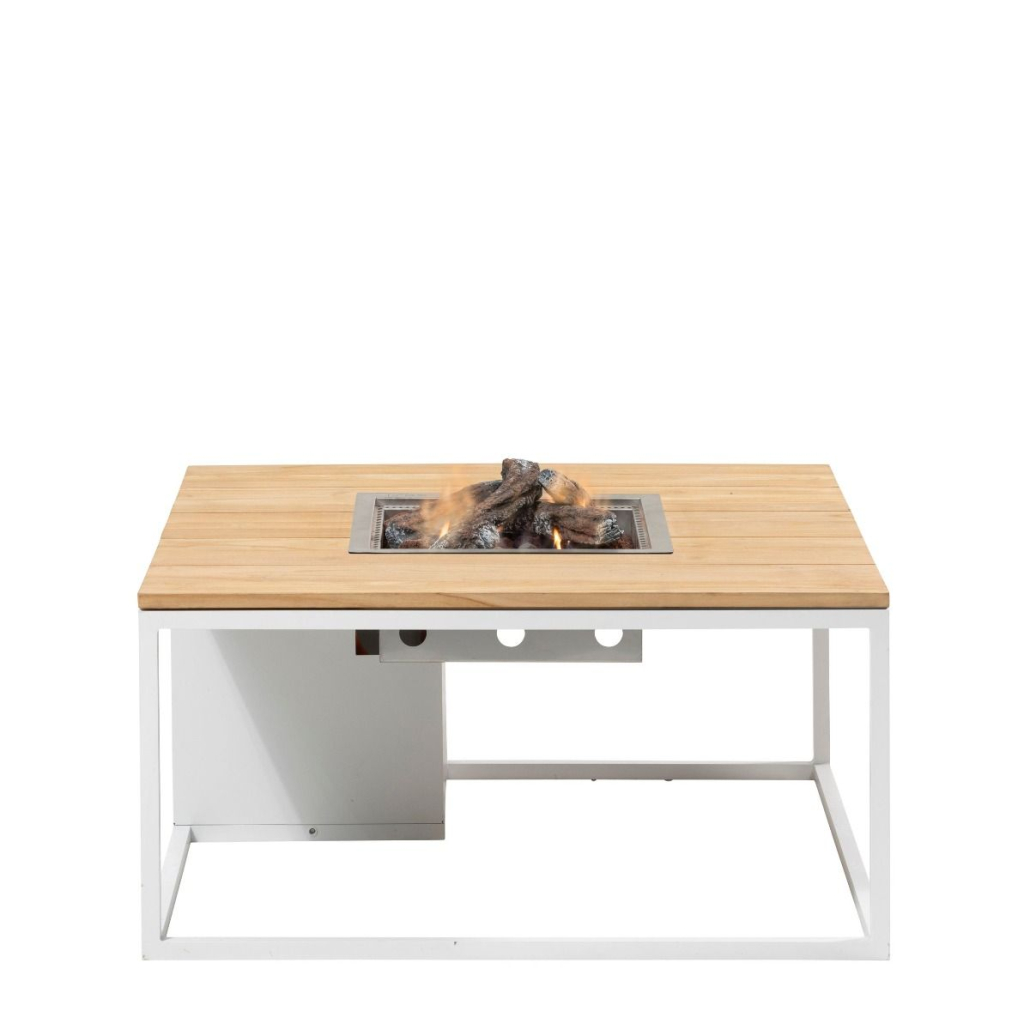 Deze vuurtafel kan haast niet meer ontbreken in de achtertuin of op het dakterras! De Cosiloft vuurtafel met stalen frame. Deze vuurtafel van Cosi-fires is zeer geliefd dankzij het gebruik van minimalistische en industriële materialen. De Cosiloft is verkrijgbaar in diverse kleuren, zoals deze uitvoering in het wit met teak. Het stalen frame wordt gecombineerd met een teakhouten tafelblad. De gasfles kan netjes onder de vuurtafel worden opgeborgen in de daarvoor bestemde box.